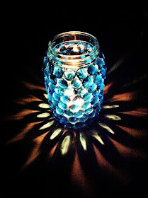Vidro coberto de vidrinhos colados com cola quente e vela dentro.